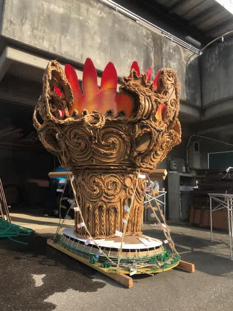 近くで観ないと素材不明ながら、上手にベニア板を曲げて本体を作り、藁縄を張り付けた火焔型土器!