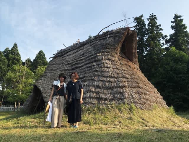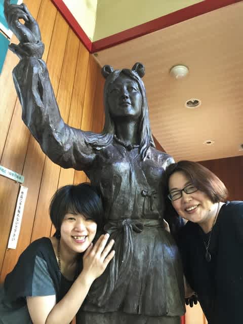 長者ケ原遺跡考古館に展示されたヌナカワ姫像の右が天川彩さんで、左が運転手役の彩さんの事務所のAさん。Aさんは画家として売り出し中!