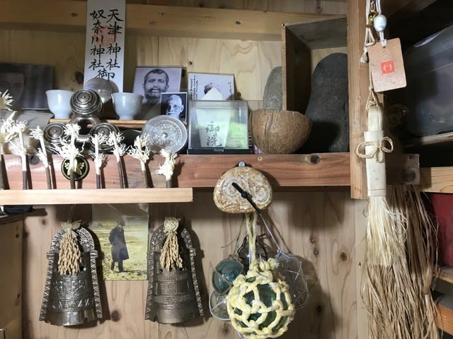 最終的に工房の神棚に安置・・・奥の写真の髭のおぢさんがラーマ・クリシュナ師匠で、カーラ(時)→カーリー神を添えるという趣向。