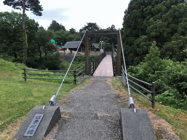 東の谷地に湧水遺構、その下の谷地に清流、さらに東には別の谷に延々と続く小径を抜けると、突然と景色が開けて吊り橋のある児童広場に出る。