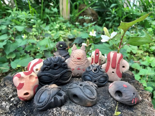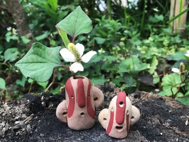ドクダミの花を頭に差しているのは、一輪挿し・ペン立てにもなる3ウエイ埴輪オカリナで、4年前に遊びで作ってから1個も売れていない(´;ω;`)