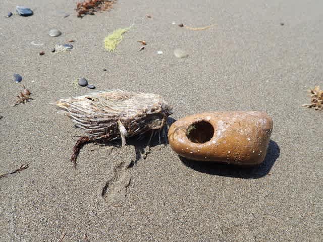 ハリセンボンのミイラと、糸魚川では珍しい砂岩の孔開き石を拾ったので吹いたらいい音で、石笛のコレクションに加えた。