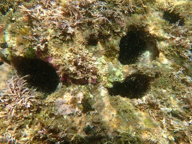 岩の割れ目や孔はムラサキウニのアパート・・・アワビやサザエ、牡蠣もウジャウジャいるけど禁漁区ということを忘れてはいけん。獲る素潜りから観る素潜りへ!