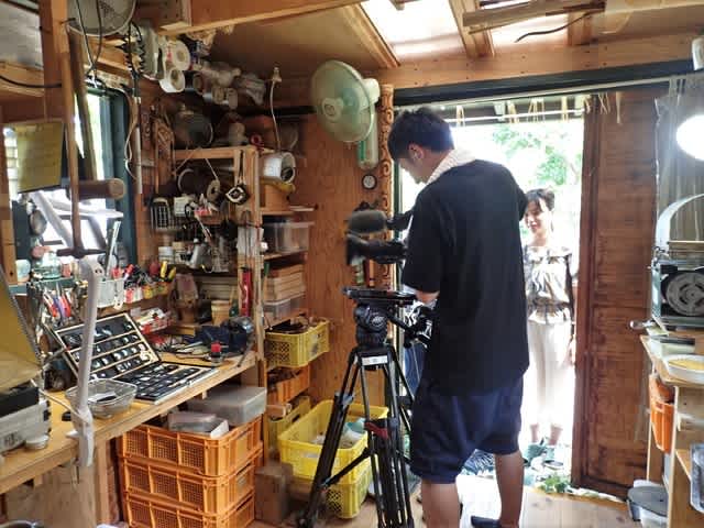 工房での撮影を2時間ほどで終えて取材班がチャーターしたタクシーまで見送ったら、なんと運転手は同級生の弟で旧知の仲のヒデチャ!2時間の撮影中、ずっとタクシーの中で待機していたそうなので「なんで顔を出さんの!」と聞いたら「みなさんの仕事の邪魔になるといけないから・・・」とはにかんでいた。実に奥ゆかしく愛すべき男。