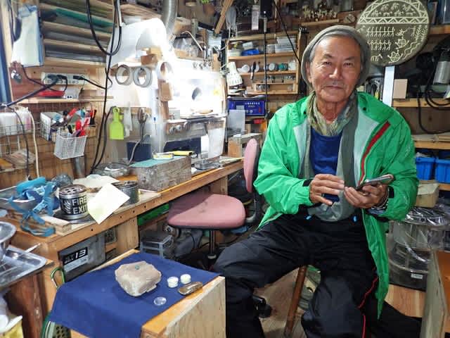 5年前の海のヒスイロード検証実験航海の時に、山形県遊佐町ののキャンプ場で会ったスーパーカブで旅する沖縄の片山さんと解り。工房に招きいれる。