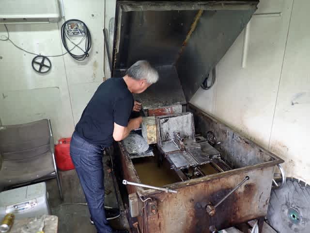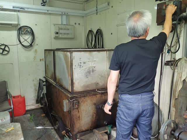 「大割機」は高価で動力電源の必要なバカでかい機械なのだ。大割機でカットするTさん。