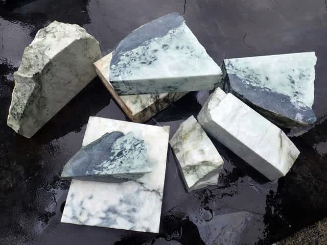 多結晶鉱物のヒスイは同じ原石の中でも部分的に硬さにバラつきがあり、原石の中から均質な部分を選ばないと丸玉が歪になるので、成否は原石選びとカット前の墨付けが勝負。