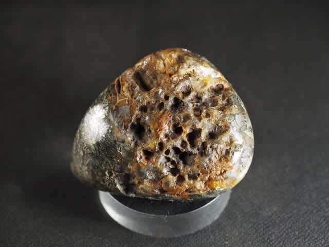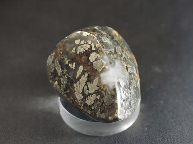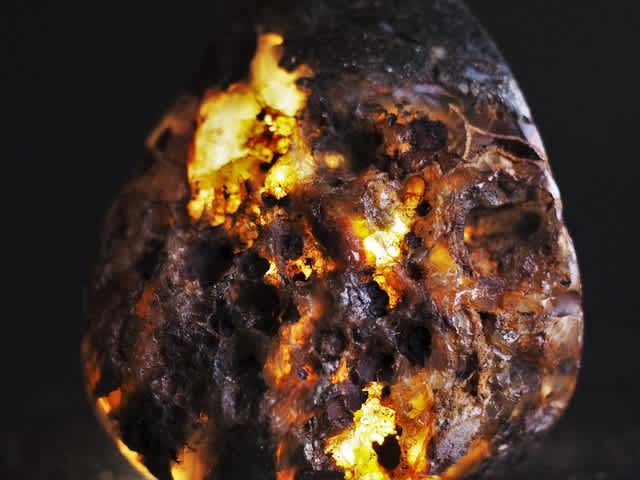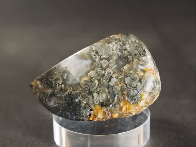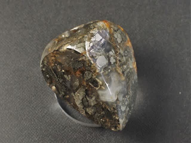 稀にメノウ化した部分が酸化鉄で黄色く変色した物もあり、原石の野趣をそのまま活かさない手はない。