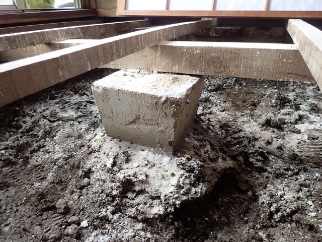 しかしだ、善意の人達が家財道具を表に出して、床下の泥を除去してくれたのはいいが、既存地盤まで掘り込んでしまったので束の基礎が傾いていることに気が付いた。