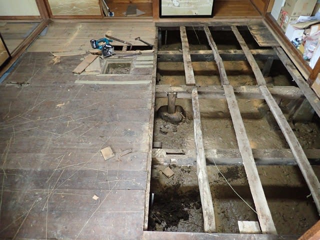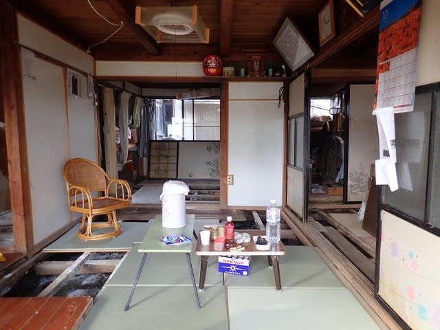 すでに1階は根太だけになっていたので、根太の補強とコンパネ、ベニア、足場板などあるものを総動員して、全ての部屋に行けるように床仮設して、屋外に置いてあった家財道具を全て家に入れることができた。