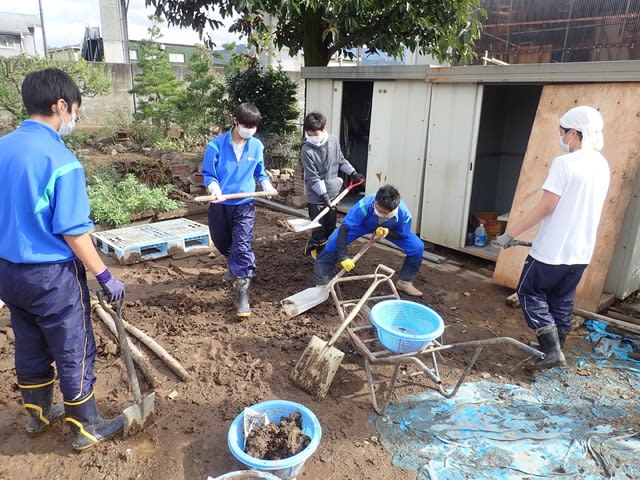 お孫さんの同級生が屋外の泥除去に来てくれたので、今後のために「スコップは前の手を順手、後ろの手を逆手にして持ち、腰を落として横から泥を掬うと疲れないし、泥を取り過ぎることはないのだ。」と、スコップの扱い方を教えてやった。