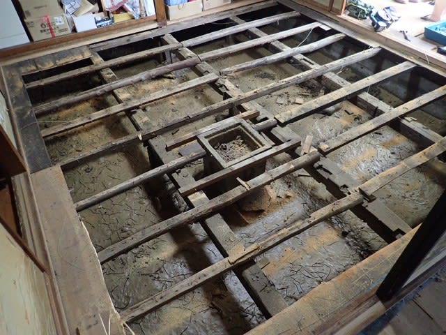 1軒目は床上浸水したお宅の床を剥いで、床下確認。延べで12畳分の床を剥いで泥の状況を確認。こちらのお宅は保険屋さんの現地確認を待つことになった。コードレス式の丸鋸が大活躍した。