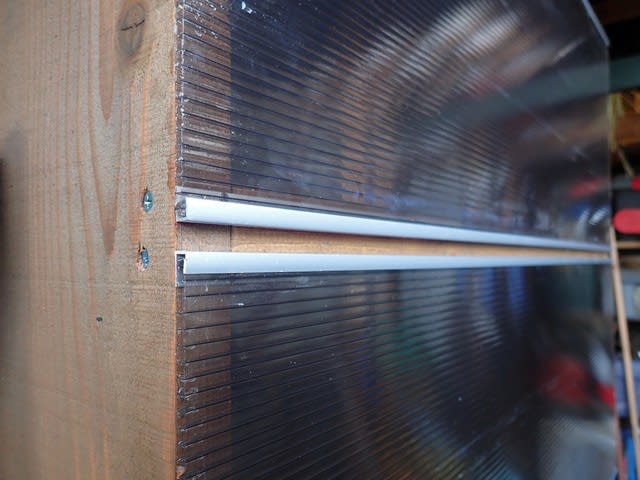 そこで幅200㎜×厚み30㎜の板材で外側に窓枠を増設して、クッションフロアー用のアルミ製止め金具でポリカ板を差し込む方式で簡易的な二重窓にしてみたら、かなり具合がいい。中央の横桟は、ポリカ板の補強と外した時の収納性を考慮したため。