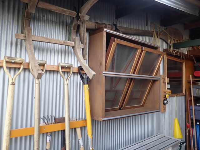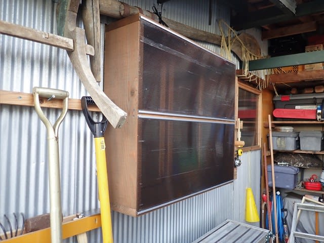 ポリカ板は差し込み、引き抜くだけで簡単に脱着ができるし、経費は窓枠の杉板材千円、ポリカ板二千円、止め金具千三百円の合計四千三百円ほど。