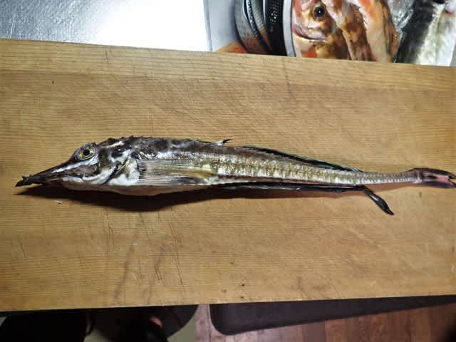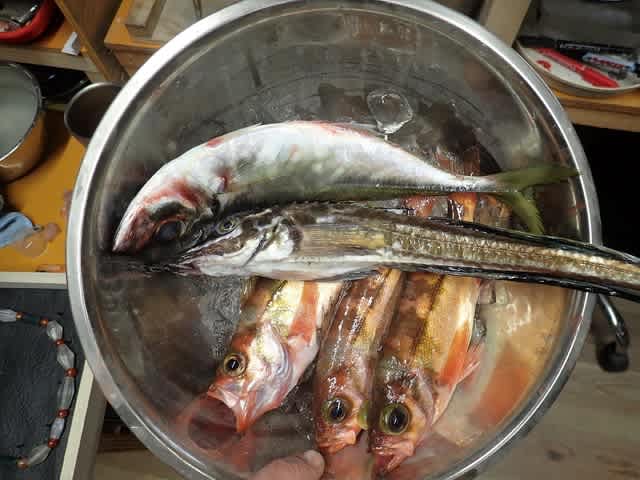 親不知の漁師、松沢船長が、セイカイ(ウスメバル)、アジ、そして初めて見る八角という珍しい魚を持ってきてくれた。