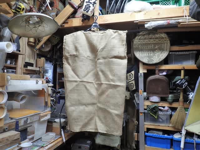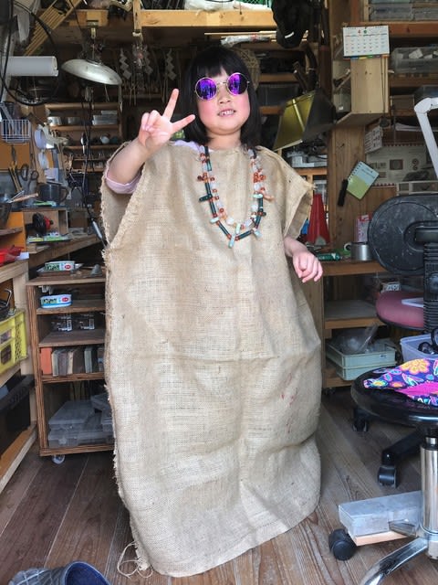 貫頭衣は、頂き物のジュート製のコーヒー袋を加工。本当は大麻生地があればいいのだけど、高いから不可。