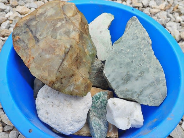 バケツに入った原石はアルビタイト・ロディン岩・石英・石灰石ばかり。