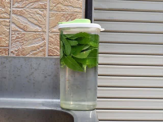 摘んだ薄荷と水を透明な容器に入れて、日向に置いておくだけで、夕方には薄荷茶のできあがり。抽出がイマイチなら、沸騰直前まで温めて一晩放置しておけばよく、来客にも好評だ。
