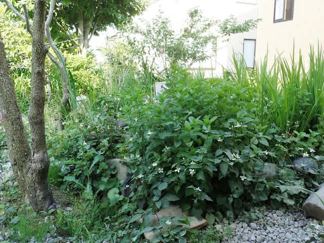 ぬなかわヒスイ工房前のストーンサークルは、薄荷とドクダミが繁殖して隠れてしまうのも今の時期ならでは。