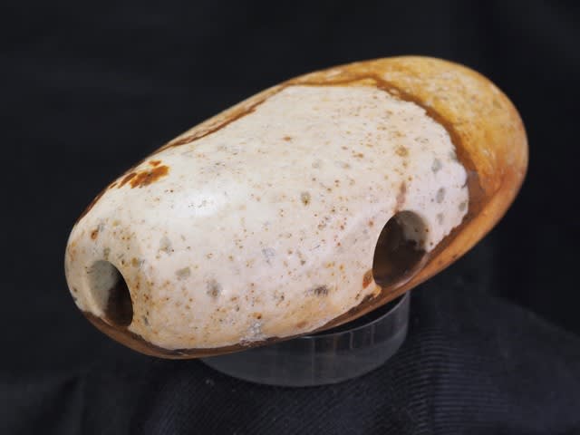 これは初心者に多い、吹き孔に当てる下唇の位置が悪くて音が出にくい人でも吹き易い石笛ということだし、私が得意ではない古神道系の「横吹き」にしても、音が出やすいということを発見した。