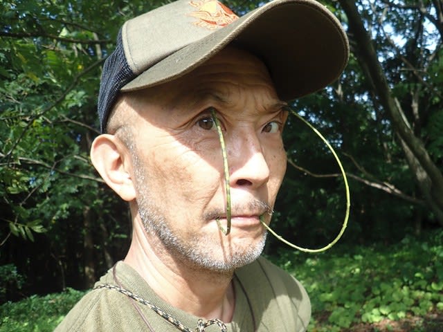 マメ科植物の茎をむしり取り、葉っぱを手でしごいて落とし、細い方を口に咥えて太い方を瞼におし当てるだけ。弾力のある植物の茎ならなんでもよいのですが、ワタクシは「覚醒材」と呼んでおりまするぞ。