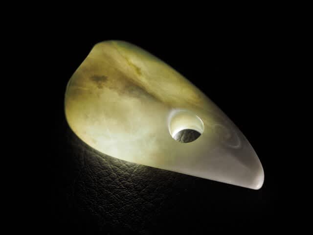 ところが食えず眠れずという集注で2週間、勾玉と石笛つくりに没頭していたら、疲労のピークで手が勝手に動いて、凹面の放物ラインが突然できてしまった。