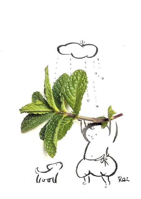 こちらは印刷だが、ミントの葉っぱを自分でなく、犬に差し掛けている童子の絵からは、仏教的な捨身(しゃしん)の慈悲を感じる。