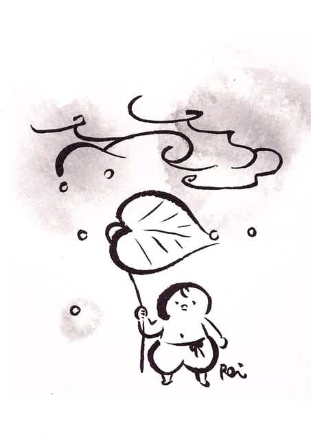 フキの葉っぱを傘にする童子の絵も、まさしく宮沢賢治の童話の挿絵のようだ。こちらも印刷。