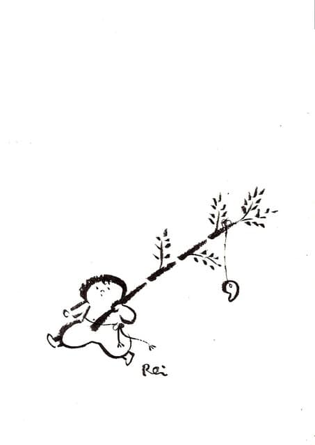 笹に勾玉を下げているのはヒスイ加工に物狂いしているのであり、歩く童子姿なのは天真爛漫で純粋な気持ちでヒスイ加工に邁進しなさいというヌナカワ姫からのメッセージが、彼女に「降りてきた」絵であると受け取った( ´艸`)