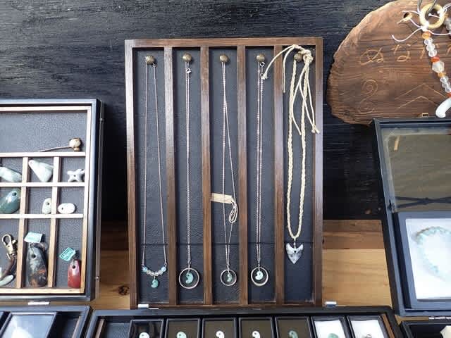 チェーン付きのペンダントの見本も、ジュエリーケース内部に2段重ねに収納できるサイズの展示板を自作したので、狭い工房でも収納・展示しやすくなったし、店外の作品展に持ち出す時の荷物が減って、展示時間作業時間が大幅に減った。
