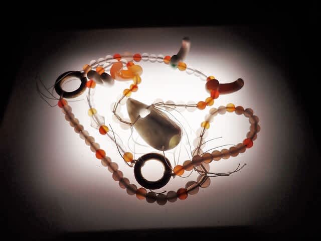 北海道県立博物館で、武四郎の「大首飾り」が特別展示されていた時の透過光を当てたディスプレイを真似て、個展用に展示台を自作した。