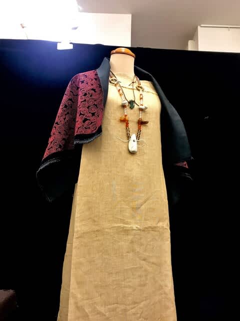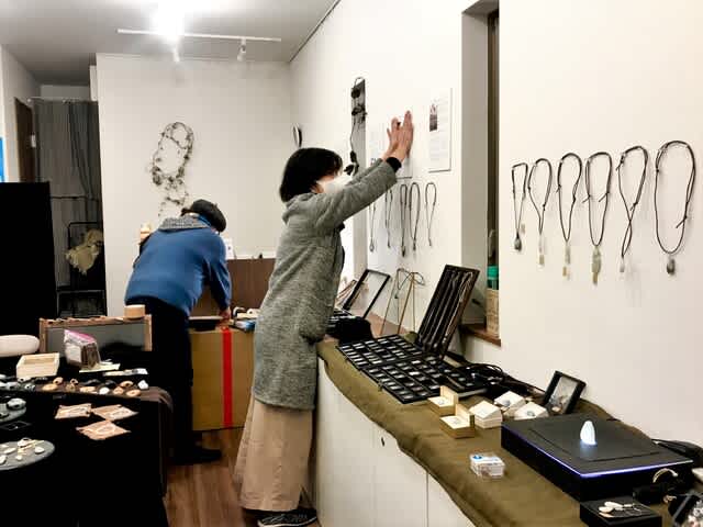 夜遅くまで作品群のデイスプレイをしたが、備品のパーテーションに布地をかけて石笛首飾りを飾ったら、プロデューサーの天川彩さんが備品のトルソーに布を巻き付けて飾るアイデアを閃いた。やってみたら大正解で「これ、ヌナカワ姫でしょ!」と一同が納得。