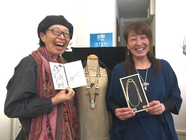 右が大麻チョーカーの作者のみやざわあかねさん、左がイラストレーターのみやれいこさん。今回の個展がきっかけで天川さんとも繋がりができて友達の輪が広がっていった。