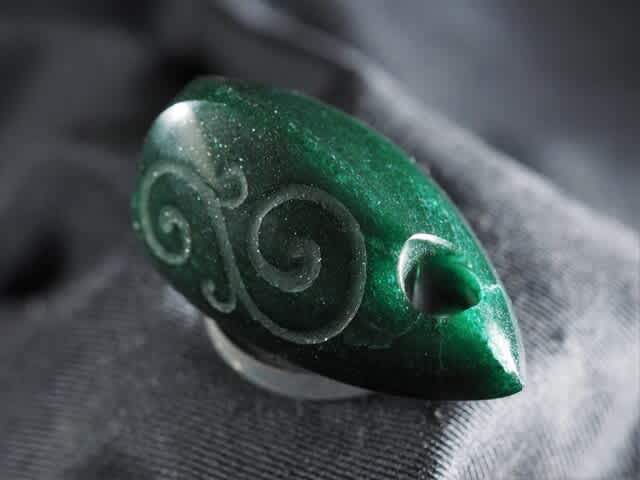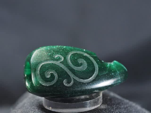 石笛を作ったら、石肌にキラキラとラメが光る、いかにもパワーストーン屋さんで安売りされていそうな印象だったので、線刻してみたらずいぶんと相性がいい。