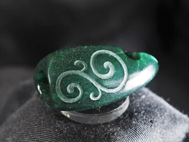 石笛を作ったら、石肌にキラキラとラメが光る、いかにもパワーストーン屋さんで安売りされていそうな印象だったので、線刻してみたらずいぶんと相性がいい。