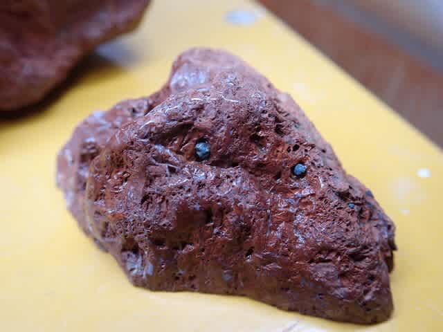 全体の8割くらいを占めるレンガ色の部分には所々に石英が含入していて、この部分が丈夫かと思いきや加工してみたら石英が抜けてポーラス(多孔質)に・・・職人言葉で「練れていない」部分。