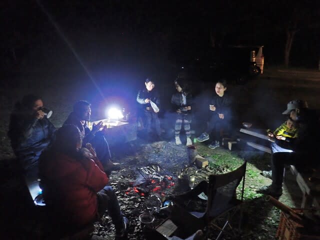 大人数だと焚火も大きくしないといけないので、煙いし熱すぎて火に近寄れないが、少人数だとチロチロと燃え続ける焚火で満足できるので火との距離が近いのもいい。