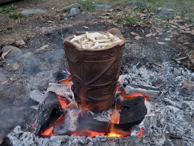 出汁は干し椎茸とコンブで、具材は縄文時代にあったものを熾火でクツクツと煮た。
