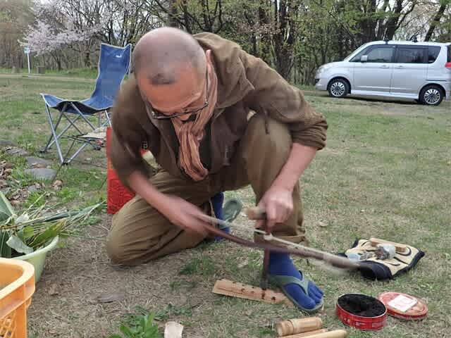 だから私は長者ヶ原遺跡での宿泊体験会は、火を主役に据えたい。縄文時代の発火具については錐揉み式発火法は確実にあったと推測されているが、北海道の縄文晩期の遺跡から出土したのが、錐揉み式にしては太すぎる火錐棒。たぶん弓錐式発火法か紐錐式発火法に使ったらしいので、私は弓錐式発火法をしている。ちなみに多くの博物館やイベントで披露している発火法は幕末に考案された舞錐式発火法だが、縄文式と嘘を教えてはいけませんヨ。