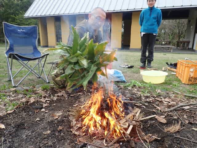 焚火が熾きたら、最初に遺跡に自生している笹とヨモギで野草茶を作って振舞う。笹っ葉は軽く炙ると香ばしいのデス。