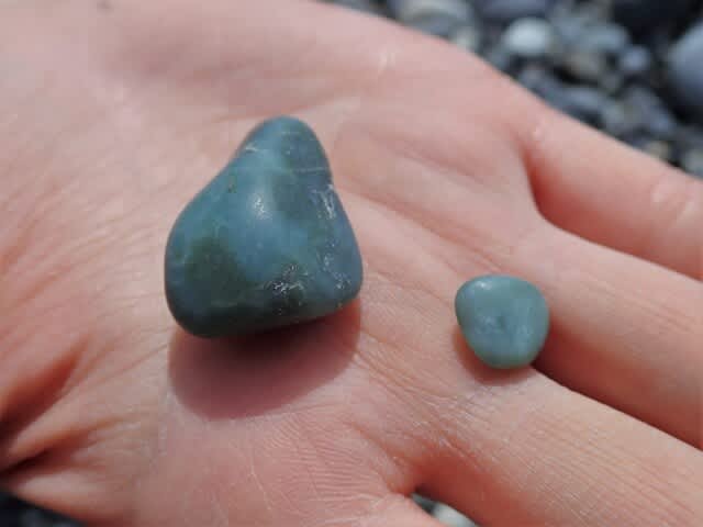 長者ヶ原遺跡に案内する前の海岸に連れて行った女性が綺麗な石をひろった。右は、硬玉ヒスイ、左が軟玉ヒスイ(ネフライト)で、どちらもかなりの品質。