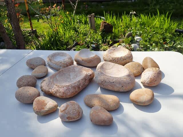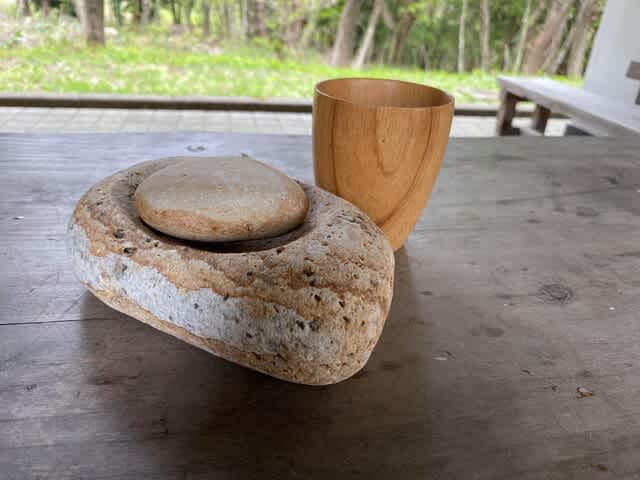 姫川薬石で作った縄文式石皿コーヒーミル・・・パクるなよぉ( ´艸`)