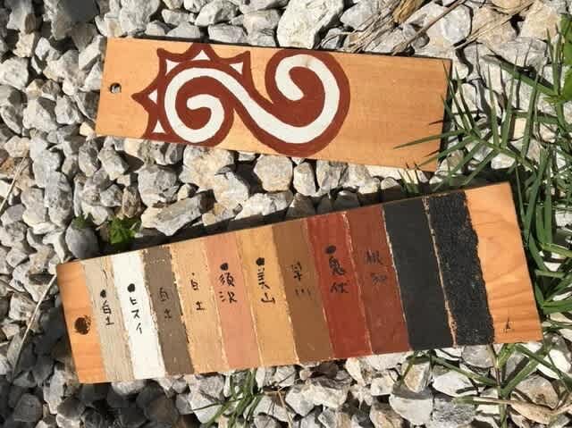 そんな情報発信に絶好の商品だから、自家製絵具のカラーチャートとヒスイとベンガラで描いた見本も持っていく。