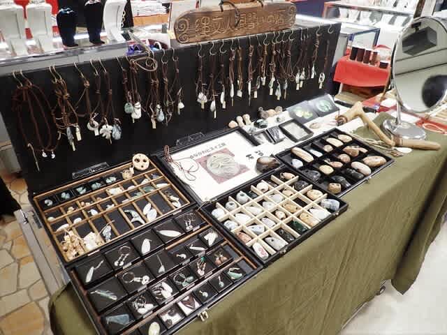 与えられた売場が幅1・5mの机をコの字形に組んであり、ぬなかわヒスイ工房にしては身分不相応に広く、体裁を整えるのに苦労(笑)