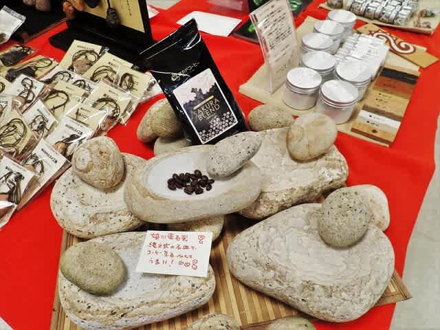販売会初日、姫川薬石で作った石皿の縄文式コーヒーミルの用途が分からない人がいたので、東京から出店していたコーヒー豆屋さんに見本に5粒ほどわけてくださらんか?と聞いたら、気前よく封を切っていない豆を一袋プレゼントしてくれた。