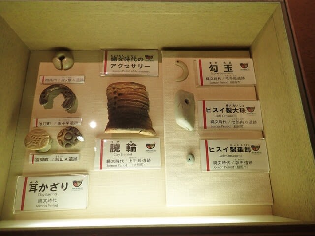 埋文に蛍光X線分析機はあっても、比較するための硬玉ヒスイのチャートがないので未測定とのことだが、それなら比重測定をしては如何?と門外漢のクセに生意気なアドバイス。左下の土製耳飾りは群馬との交易品か?中央の土製腕輪も珍しい。