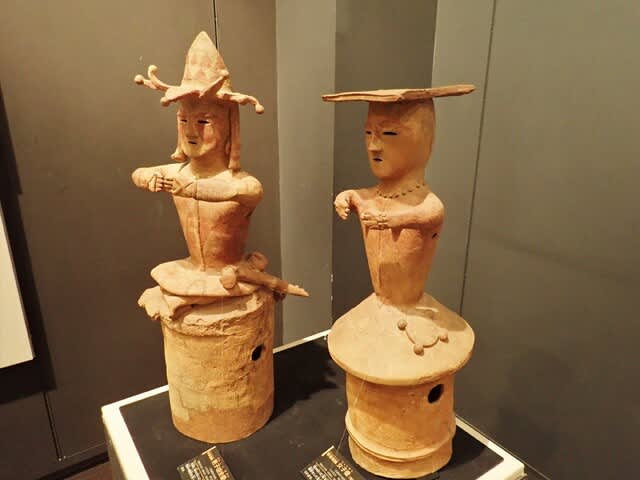 鈴鏡の使用例がわかる埴輪で、左の男性は左腰に剣、右の女性は同じく左腰に鈴鏡をつけている・・・福島県立博物館収蔵品