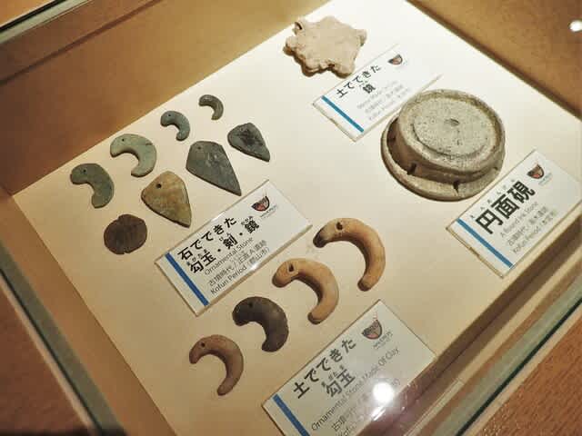 土製の勾玉と、グリーンタフ製や滑石製らしき薄い勾玉・小型の剣と鏡が面白い。