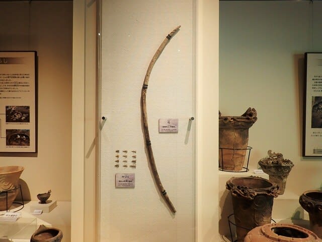 3,000年前のマユミ(真弓)で作られた湖南町の「山ノ神遺跡」出土品であるとのこと。縄文時代の弓の完形は、富山の桜町遺跡で観た以来の珍しい出土品。