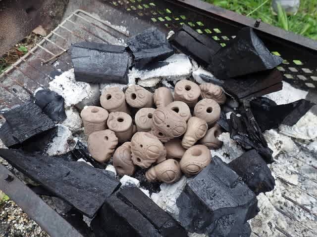 通常は成形した後に1~2週間は乾燥させてから焼成するのだけど、参加者が持ち帰りやすいように少しでも乾燥させようとバーベキューコンロの熾火で乾かしていたら、予想外に赤く変色した炙り焼き状態までいってくれた。